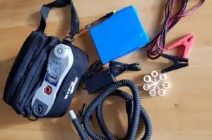 Automatische opblaaspomp met eigen accu. Hiermee kunt u gemakkelijk en snel binnen 10 minuten uw SpearFish opblazen. Met deze pomp heeft u geen netspanning of 12V accu nodig want die zit er al in. Superhandig!