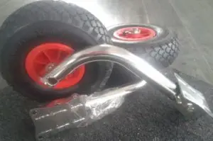 2 wielen (opklapbaar, te monteren op de spiegel) Erg handig voor het vervoer van de rubberboot (of deze nu opgeblazen is of niet) en zo wordt zwaar slepen met boot én motor verleden tijd! Ook praktisch op het strand of om de opgevouwen rib mee te nemen
